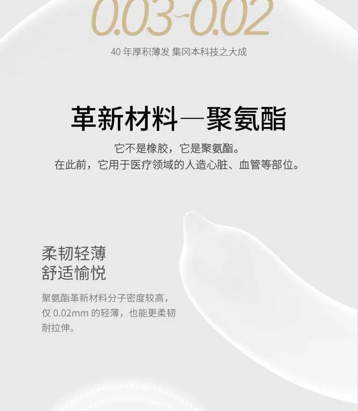 002和001都是近年来新流行的聚氨酯材质制成的安全套。冈本创新水性聚氨酯材质,打破了传统套套的壁垒,在追求“薄”这件事上,钻研80年,只为不断超越自我。