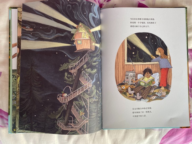 你看这本绘本里,介绍的树屋构造,真的非常奇妙,不仅有卧室,书房,还能建成培养植物的花园。