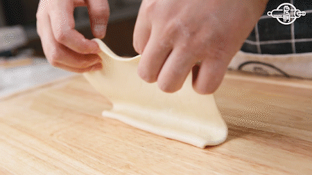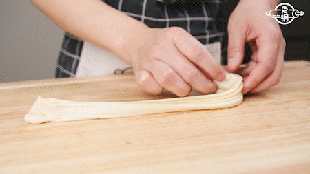 拉住两端,将长条状的面团拉长,然后从一端慢慢卷起,尾部收于底部