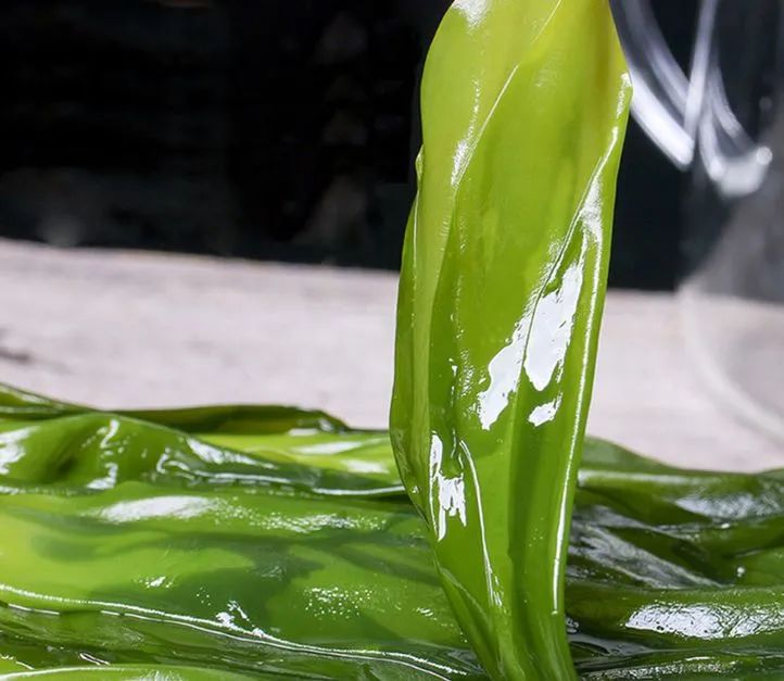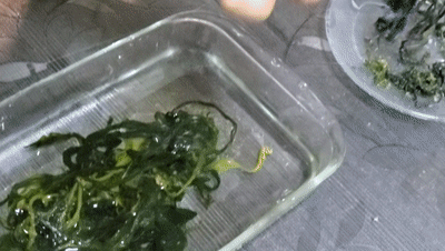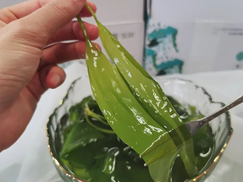 生长15天左右的海带苗,这时在光照下绿得像晶莹翡翠,薄如蝉翼,特别鲜嫩。 和成熟海带的口感不同,海带嫩芽以滑爽见长。吃过的朋友就知道,在嫩之外,还多了一重鲜味。