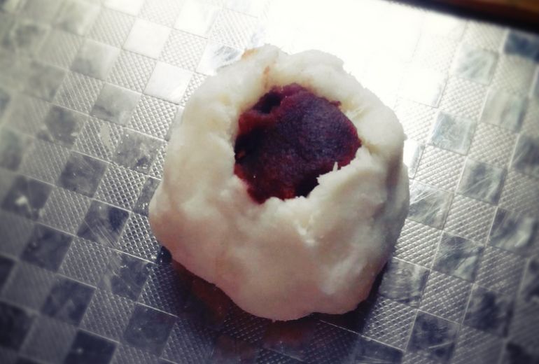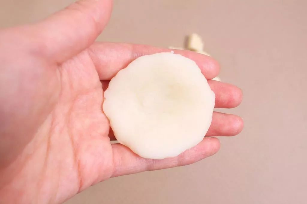 3、取山药面剂子,用手在中间摁个坑,放入红豆馅馅心,虎口和拇指用力,包成豆包坯子;