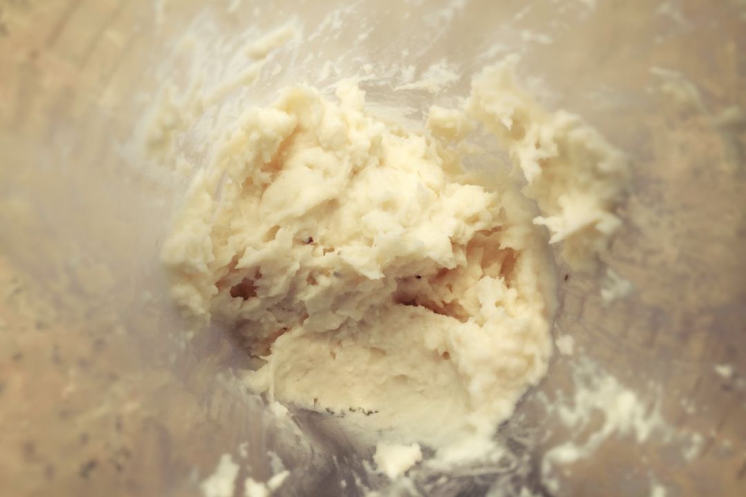 3、去皮的山药用擀面杖压成泥,放入盆中;