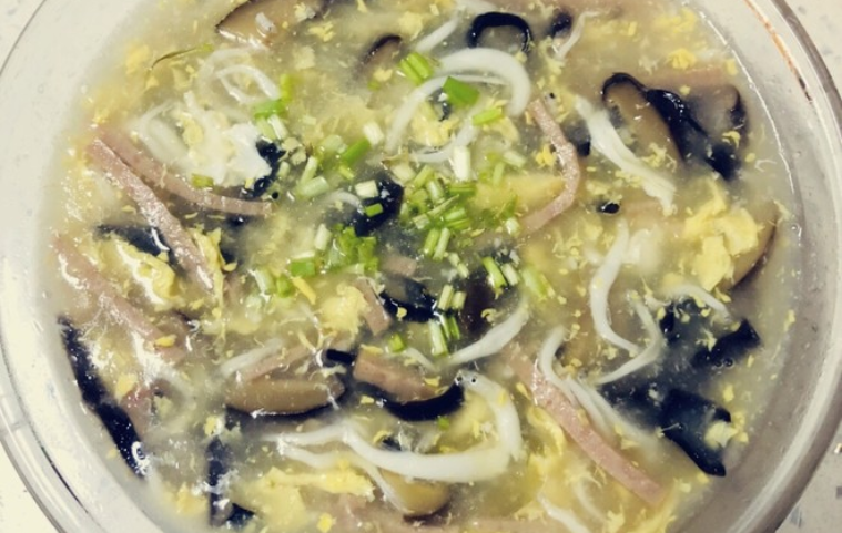 3.水烧滚后加入银鱼、香菇、木耳,会冒出白沫,加冷水,将浮沫撇出。加入鸡蛋🥚烧开后加水淀粉、盐🧂。最后加入午餐肉。