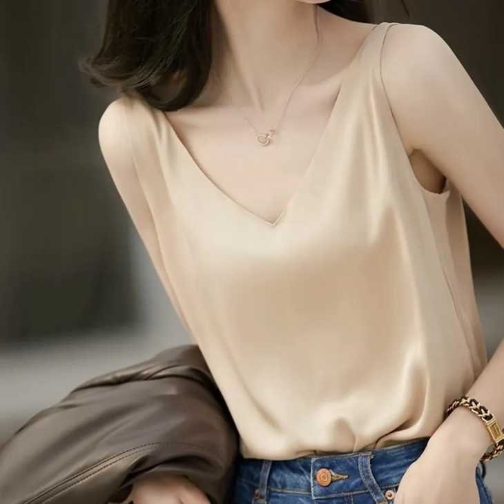 直接单穿不会有内搭外穿的感觉,日常通勤穿也很得体。凉快又优雅,很适合搭配西装裤、半身裙,打造知性大方的通勤风。真丝的材质不仅贵,在生活中还容易皱,而这款仿真丝材质的吊带,纤维之间排列更加紧密,能更好地抗伸缩变形,性价比更高。垂顺有光泽的仿真丝缎面面料,不仅赋予了它很好的舒适度,还让它显得非常有质感,优雅高级有气质。却比真丝好打理许多,耐洗耐穿。柔软丝滑,再加上它独有的光泽感,宛如珍珠在黑夜中熠熠生辉,挡不住的高级感。大V领的延伸感,恰到好处的露肤度,胸前肌肤与脖子连成一片,拉长颈部线条,营造轻盈纤弱的美感。合体的H版型,加上面料良好的垂坠感,穿起来优雅利落显精神。