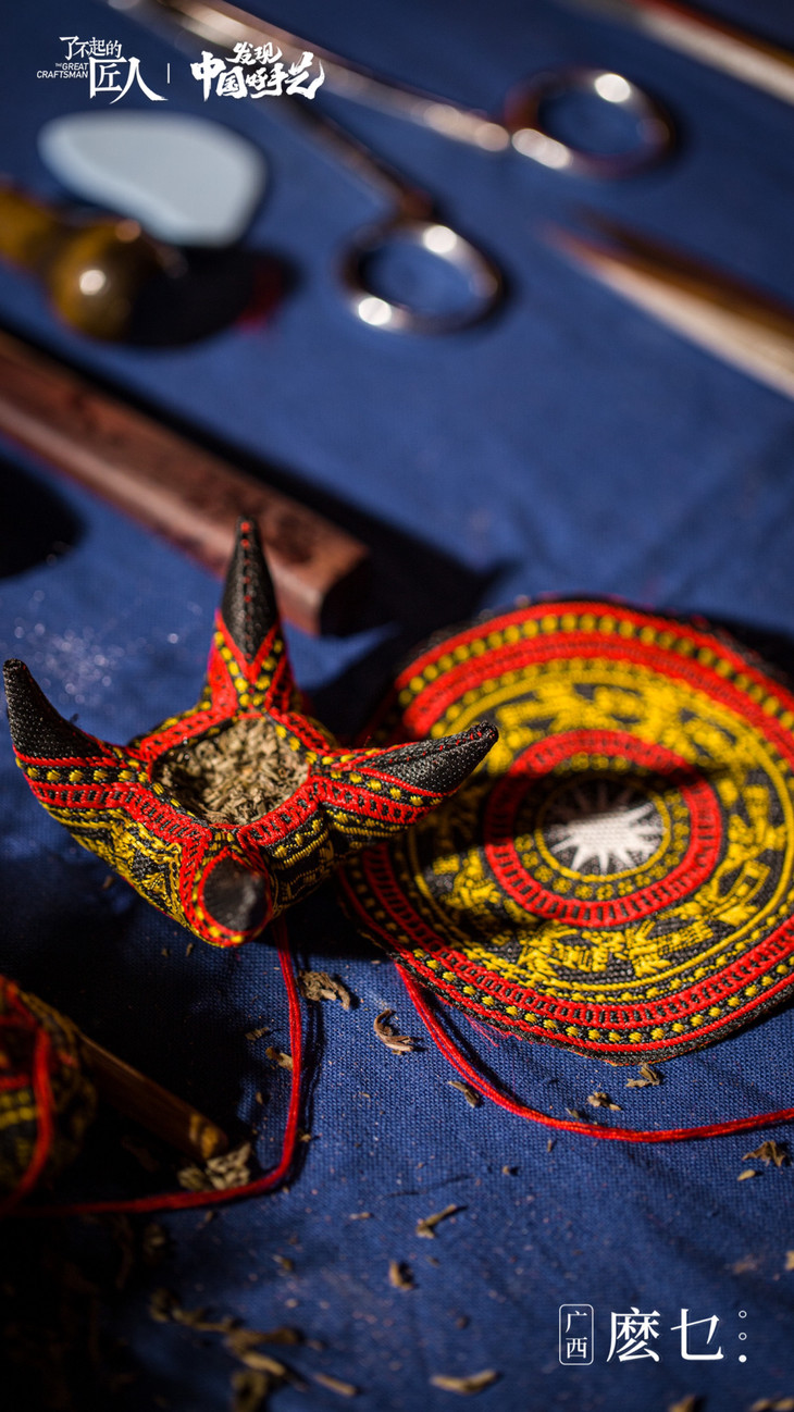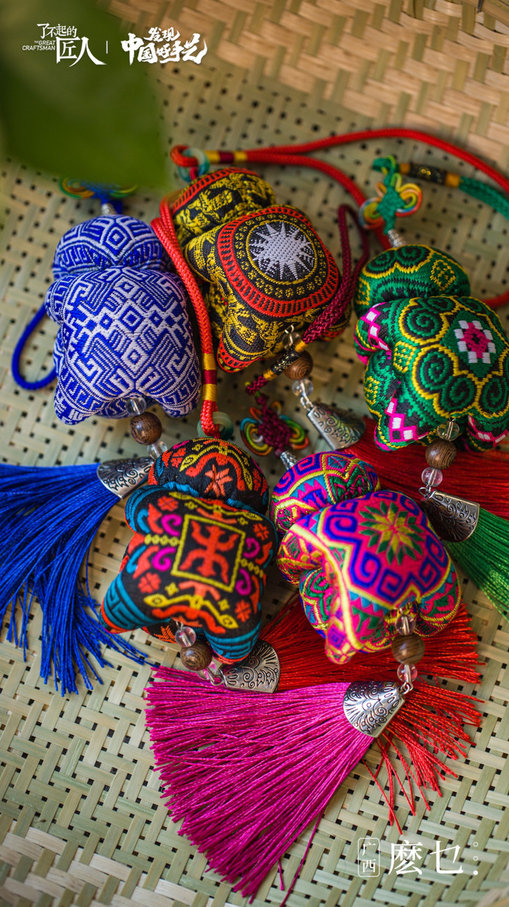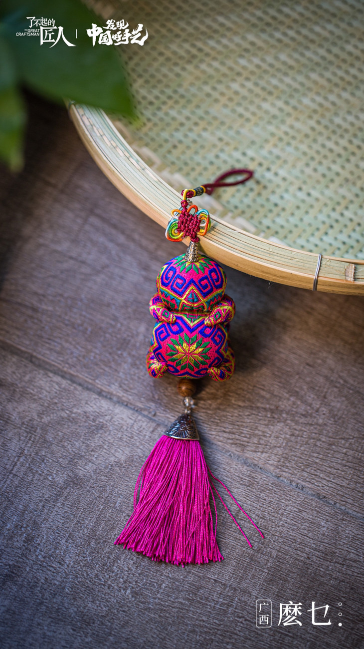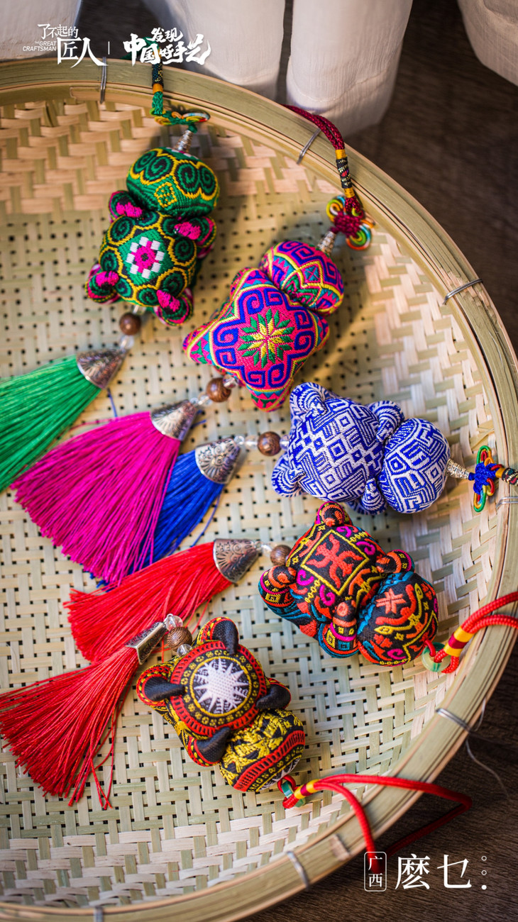 “麽乜”(mō miē)从壮语翻译过来有着神与母亲的意思,壮族特有的香囊配饰物。这是一门曾经被人们遗忘了半个世纪的民间手工艺,它承载了壮族先民神话传说和文化祈愿。