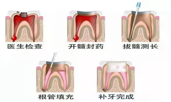 首先去净腐质开髓,再进行清理消毒根管,清除干净根管壁上面的感染物,然后再进行冲洗,冲洗的目的就是清除微生物,残渣等,然后放置消炎药进行根管消毒使其达到无菌状态,接着是根管填充,用材料将根管系统充填起来,并将牙齿外观恢复起来。