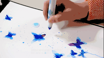 画过了常规画法的孩子,可以再来点高难度的,滴上几滴水,画出水彩画的效果,吹一吹,颜色就喷展开来。