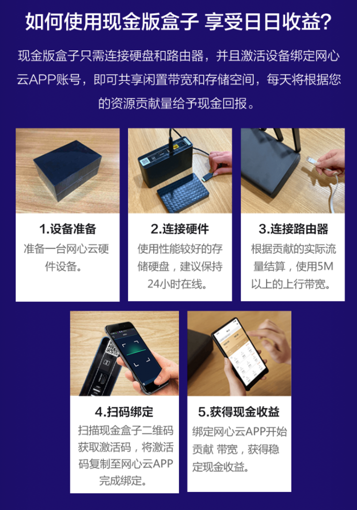 对普通用户而言,赚钱宝3代「现金版盒子」操作方式简单方便,一次设置成功后便可长期使用。只需连接硬盘和路由器,并且激活设备绑定网心云APP账号,即可共享闲置带宽和存储空间,每天将根据资源贡献量给予现金回报。