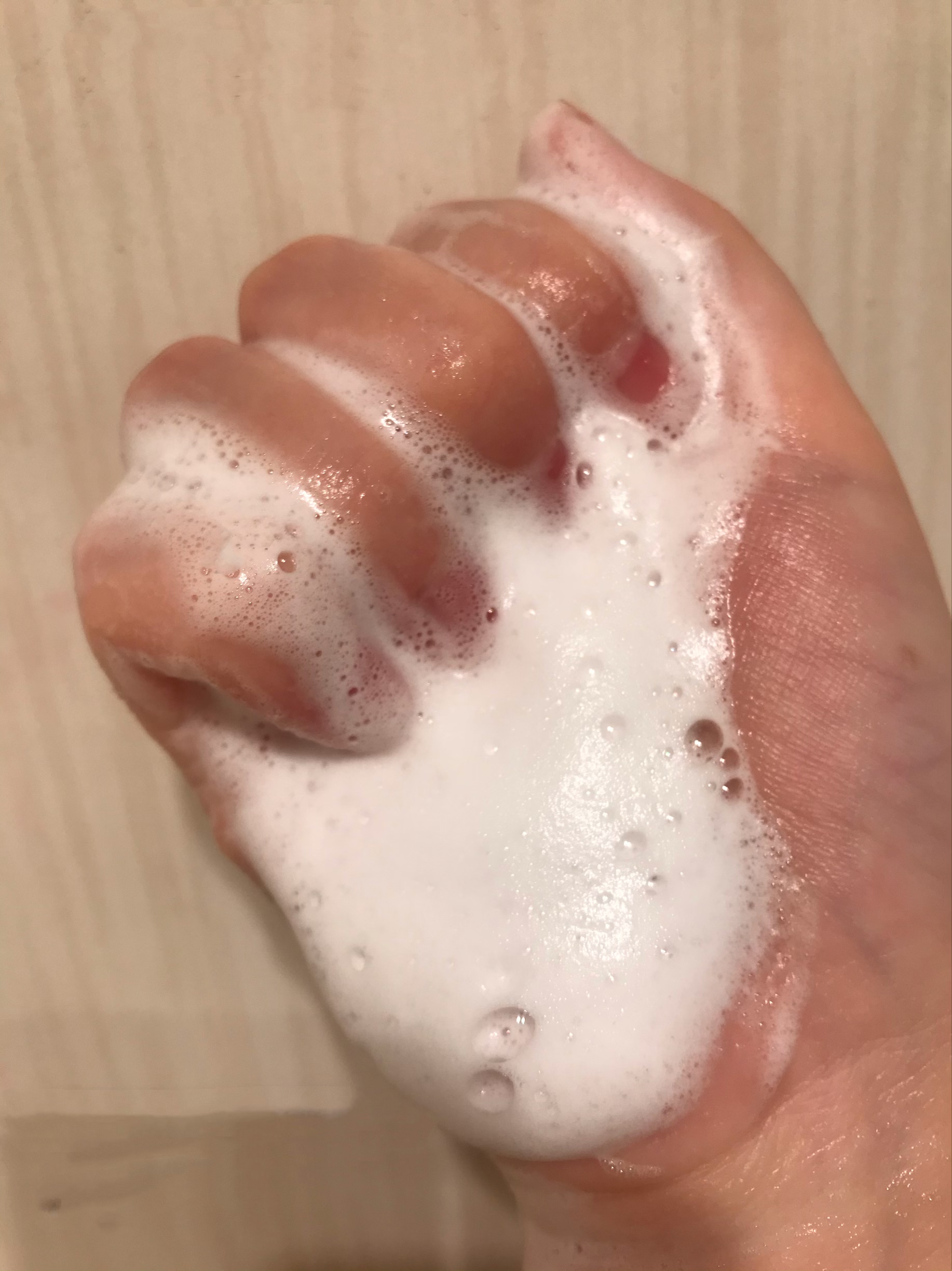 然后,淡粉色膏体,用量很节省,挤黄豆大小用手搓就会有丰富的泡沫了。一支用半年多是没得问题的。