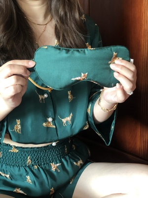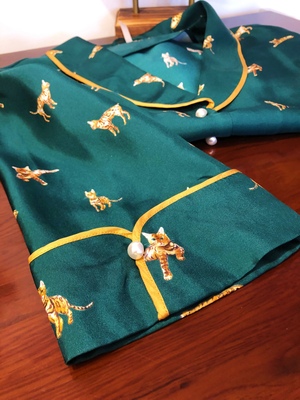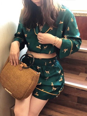“这款真丝睡衣不仅仅是睡衣,完全可以出街穿,绿色很正,小猫🐱的图案很可爱,细微之处的做工也很精致,上衣腰身是松紧设计,搭配了一个藤编包,完全可以街拍,作为睡衣的设计感实在是太赞,期待夏天快点来”