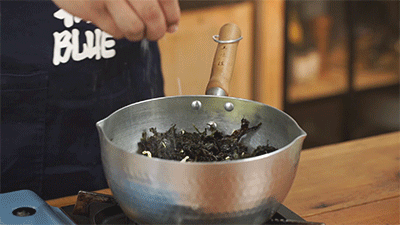 紫菜撕成小块放入锅中,不用放油、放水,先烘香一下