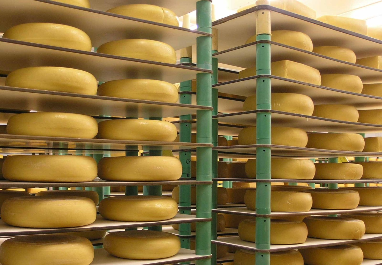 奶酪加工厂紧邻牧场,每天采奶完毕,新鲜的牛奶会立刻被送往加工场进行发酵生产,经灭菌、凝乳、脱水、塑性等环节后,熟成获得优质奶酪。生产过程不添加防腐剂,实现产品的全程可追溯。