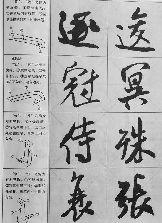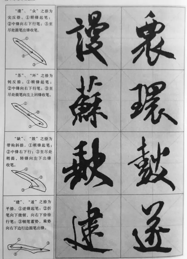 三是要抓住米字的特点,如捺的变化很多,横画与直画有时不直而曲,不平而斜,钩有时比一般书家的写法多一波折。