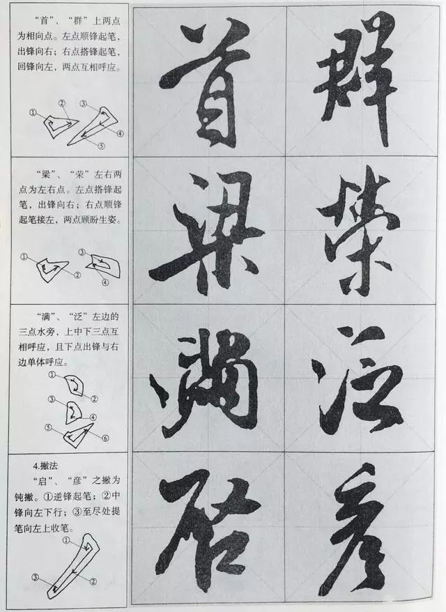 此外,米芾行书的笔画变化也比楷书复杂得多。如行书之撇,既有长、短、斜、竖之分,又有出锋、回锋之别;回锋撇中,还有回锋于右及回锋于左的不同。至于点,更是俯仰方圆,随字赋形;斜正左右,因势而异。我们在学习米芾行书用笔时,必须注意三点: