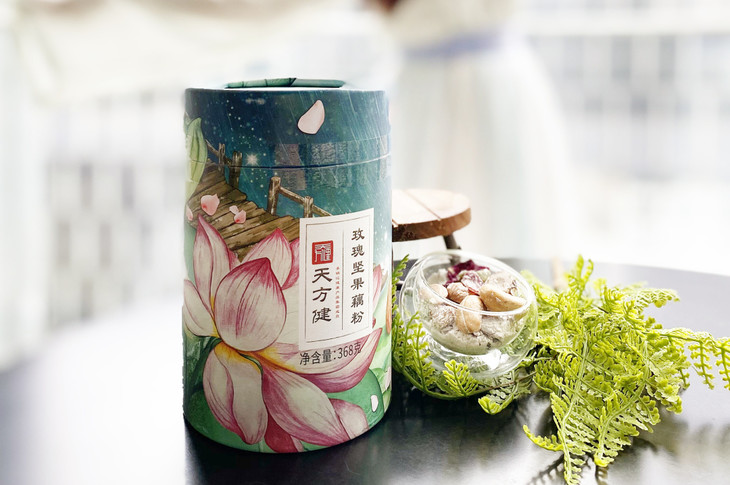 天方健的玫瑰坚果藕粉,内含7种不同的坚果和果干,包括葡萄干、蔓越莓干、腰果仁、南瓜籽仁、杏仁、红枣与玫瑰花,含量高达45%,极大的满足人体所需的营养与能量。