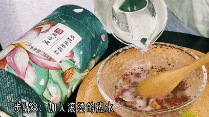 3. 再一次性加入160毫升左右的滚烫开水(95℃以上)冲泡,边冲边搅拌,至糊状即可食用。