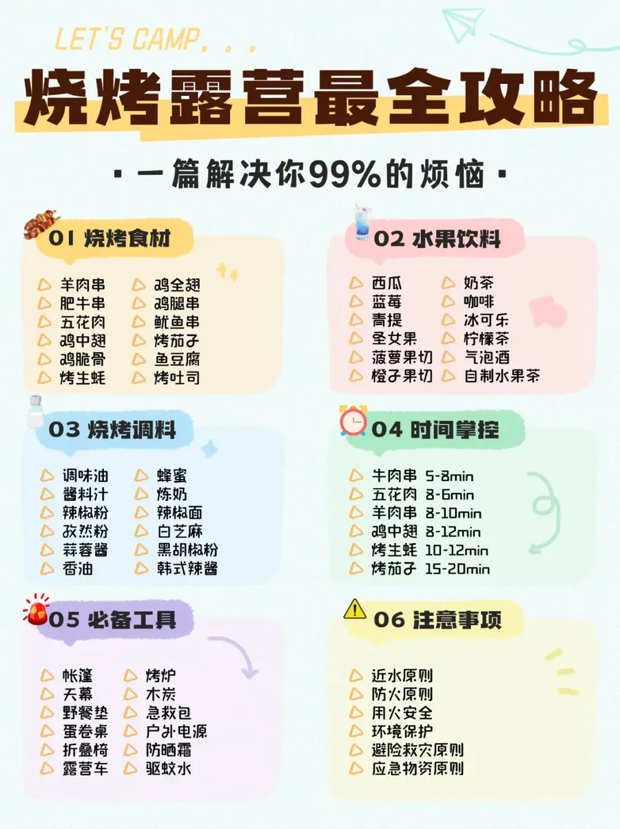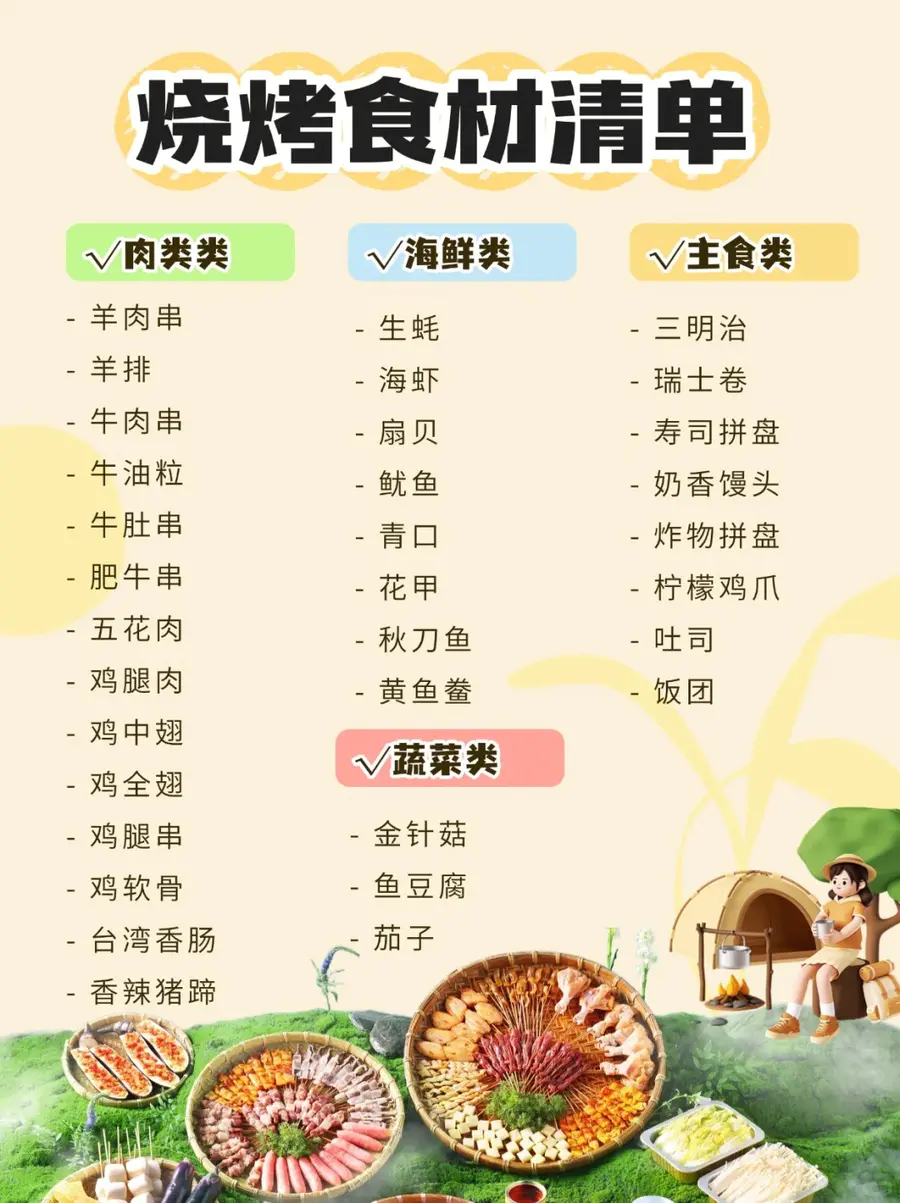 LET'S CAMP!烧烤露营保姆级攻略来啦~ 别再问“烧烤要准备啥”啦! 这份露营烧烤保姆级清单我都帮你列好了👇 新手看完也能立刻出发不踩坑!