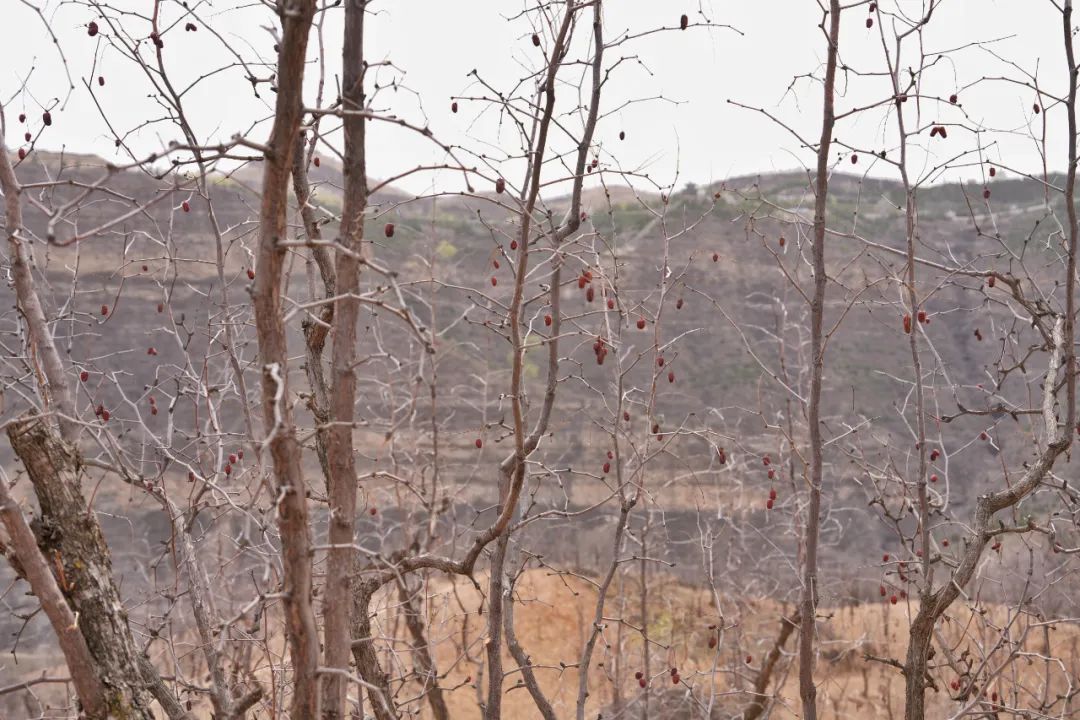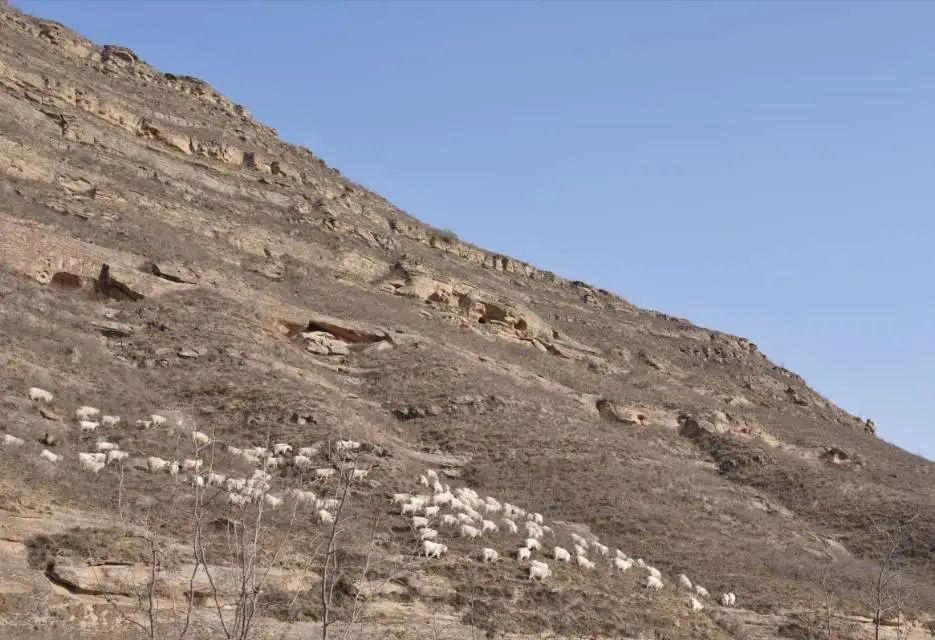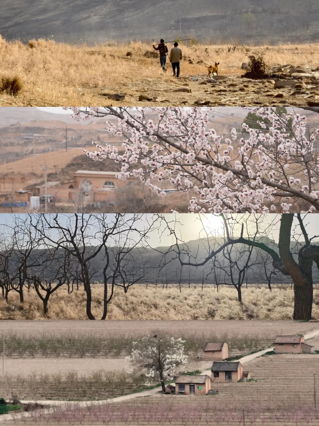 夕阳下,牧羊人与羊群剪影,枯黄的草地与光秃的枣林,构成了一幅天然的黄土高坡风情画。春风拂面,仿佛急着要把这片黄色调色盘染绿......