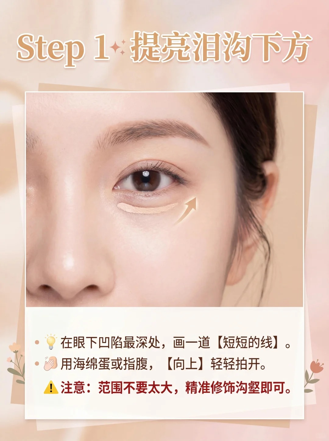 在眼下泪沟最凹陷的地方,用遮瑕液画一道短短的线,然后用海绵蛋或指腹轻轻向上拍开。注意是向上哦!这样能自然地抚平泪沟阴影。