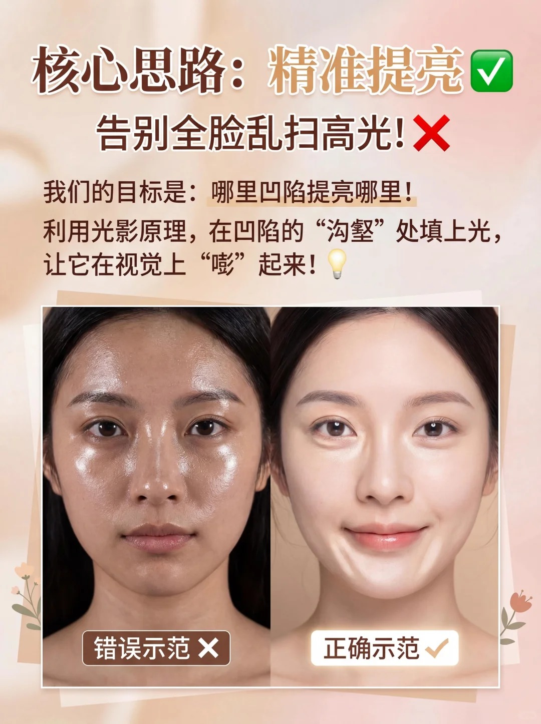 放弃大面积的珠光高光吧!那样只会显毛孔!我们要用【哑光高光】或者【比粉底浅1-2号的遮瑕】,在凹陷的沟壑处精准提亮!