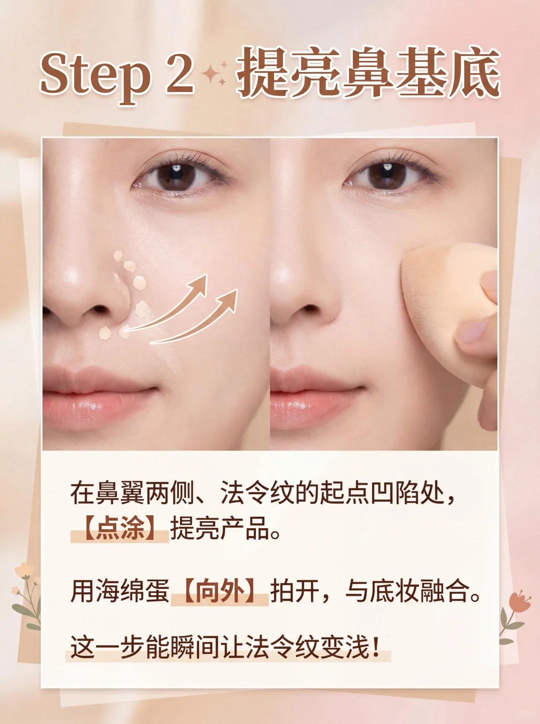 鼻翼两侧的凹陷,是法令纹的“万恶之源”!在这里点涂一点遮瑕,然后向外、向苹果肌方向拍开,法令纹瞬间隐形!