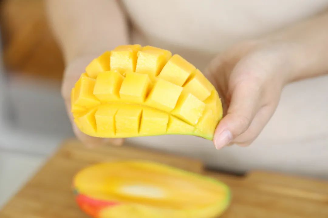⑥芒果化格子切小块备用。