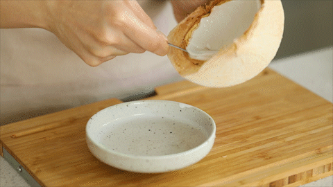 ①椰子水倒出备用;椰子肉挖出备用。