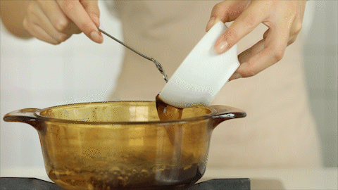 ③ 煮好的仙草糊倒入盘子里,