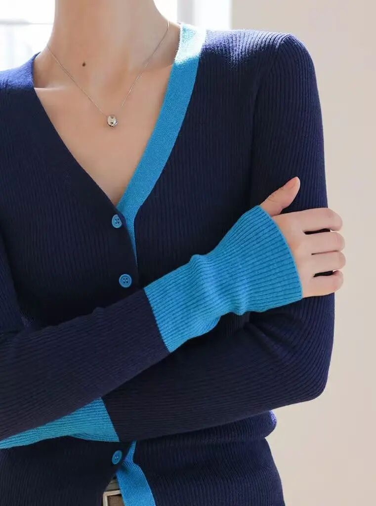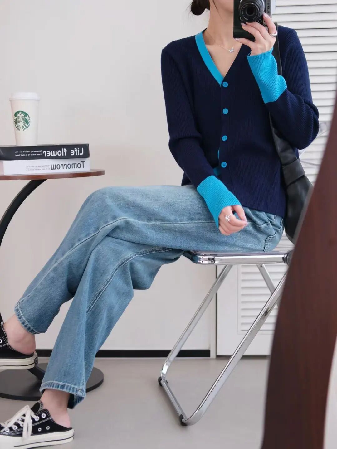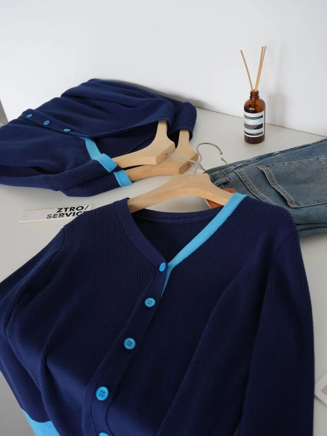简洁的V领收腰线条,化解整体素雅的感觉。领口➕袖口➕门襟纽扣撞色设计🧶一方面丰富视觉美感 ,纵向延伸身体线条