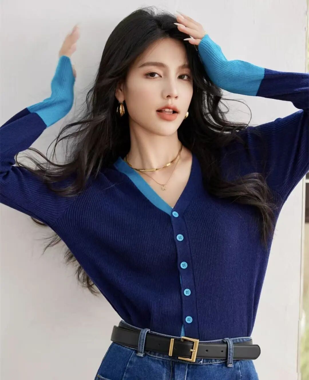 挑了很久才挑种这款上身超好看的克莱因蓝撞色针织衫,样式简约百搭,最重要的它颜色非常显白!