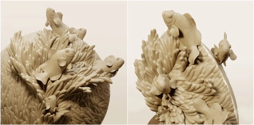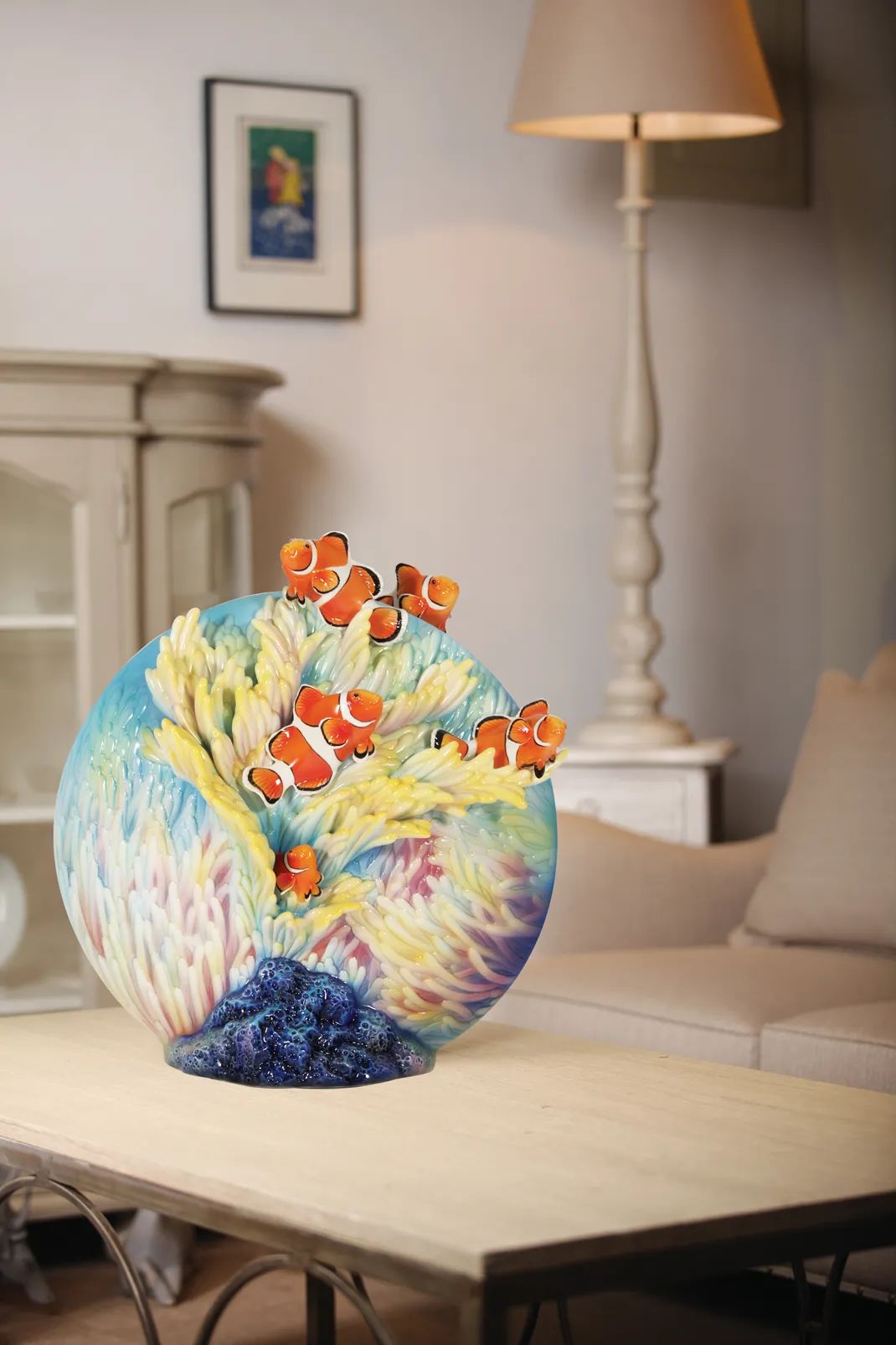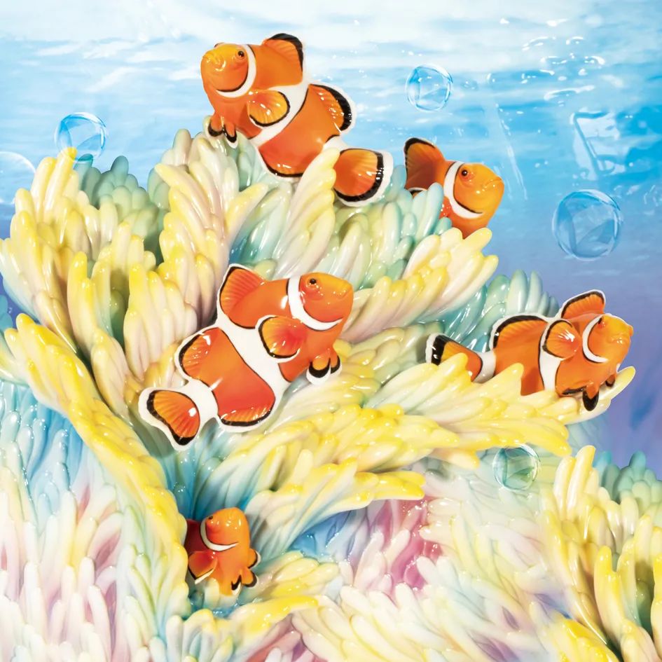 因此,瓷品设计特意以丰富的渐层色彩妆点海葵,也因此整件作品五彩缤纷。在「亮丽人生」作品上,海葵仿彿是小丑鱼的家,小丑鱼也因此从中获得归属及安全感。
