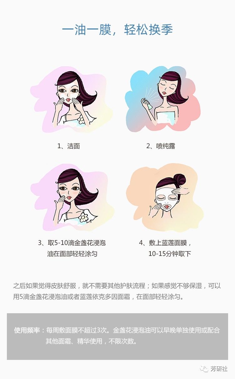 产品用法:洁面-喷洒纯露之后,取5-10滴金盏花浸泡油在面部轻轻涂匀,然后敷上一张蓝莲花面膜,10-15分钟后取下。