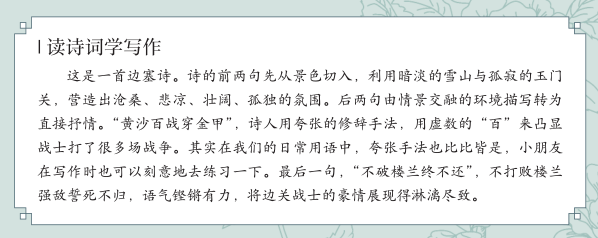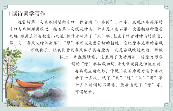 学到怎样从边塞诗《从军行》中,描写大漠孤烟的壮美景色,还有《泊船瓜洲》中,字词斟酌对写作的润色——