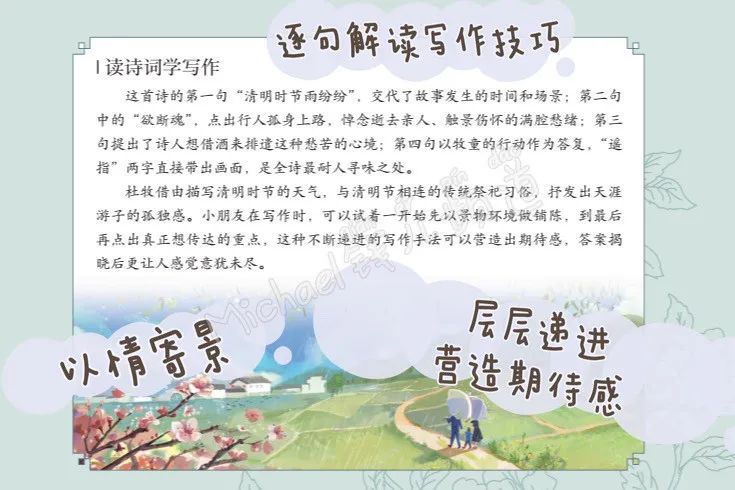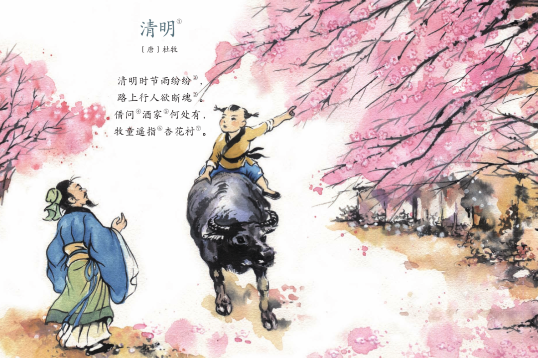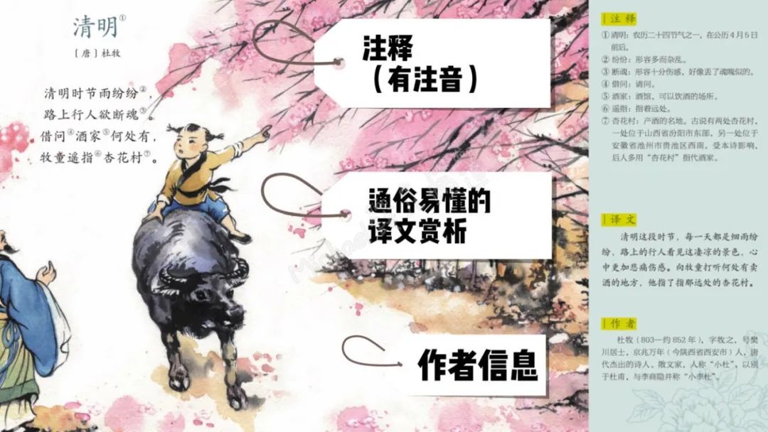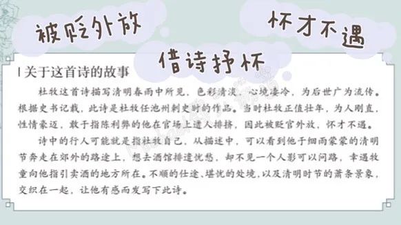 而且,知识点还会继续延伸,讲一讲孩子课本中、考试中涉及的。比如刚刚过去的清明节,这首杜牧的《清明》——