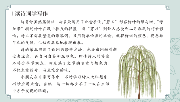 不仅会学到《咏柳》中用到的三个让人赞叹的比喻,《鹿柴》里的反面衬托,这都是非常好的写作方法,可以在日常的写作中学以致用。
