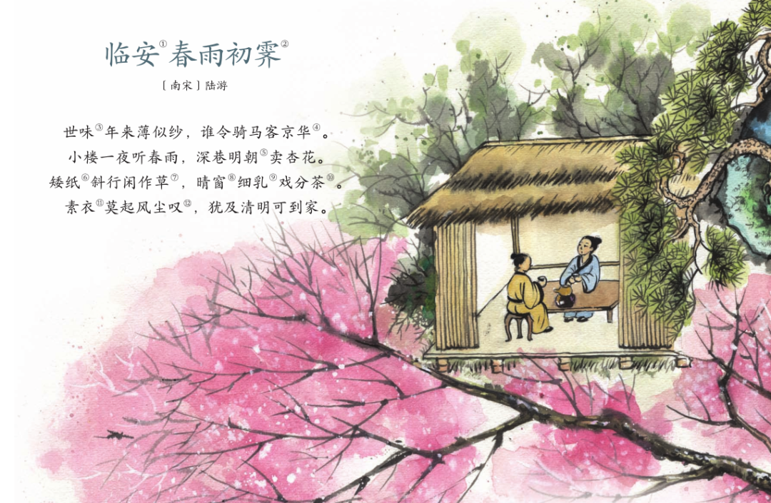 不仅有课内知识,书中还拓展了大量的课外知识。比如,读陆游的《临安春雨初霁》——