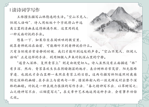 而另一个,则是对孩子写作帮助很大的“读诗词学写作”部分,孩子写作中就能拿来用。