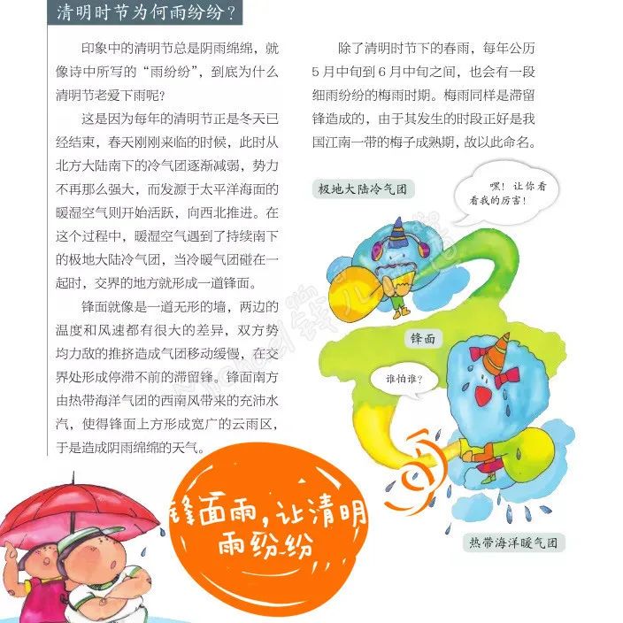 当读到“清明时节雨纷纷”时,书中启发孩子思考,引入气象科学知识——
