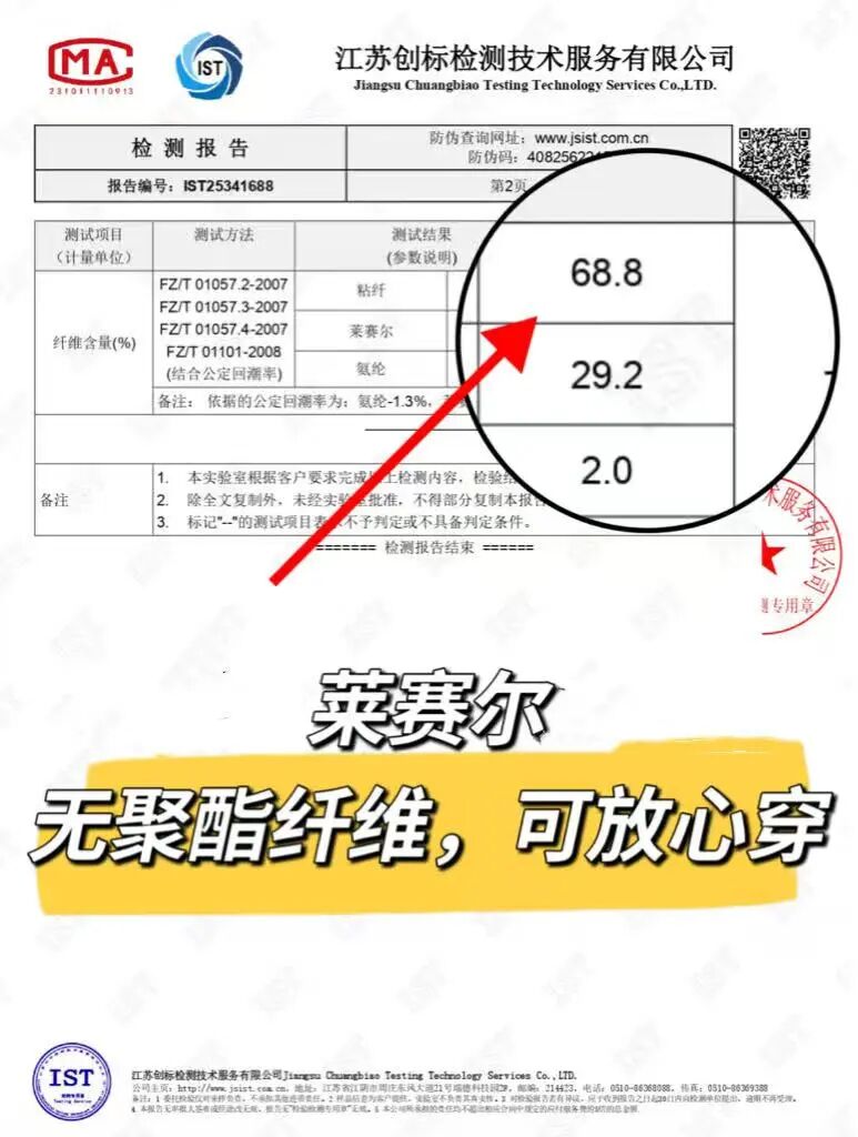 这款面料穿上的舒适度能让你舒服到拖不下来!!!莱赛尔含量高达29.2%!媲美真丝的肌肤触感!