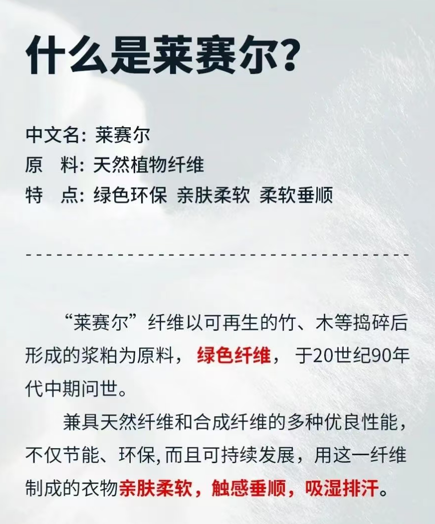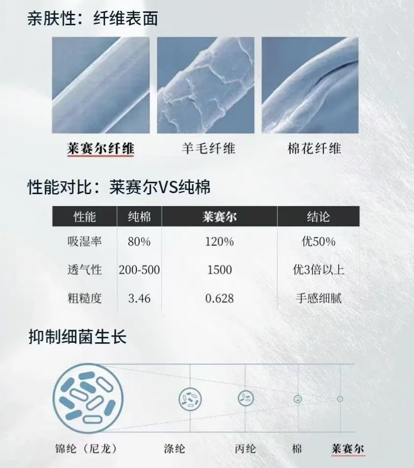 莱赛尔天丝是用天.然木浆制成的再.生纤维,比棉更柔软,比化纤更亲肤!透气性也更好!