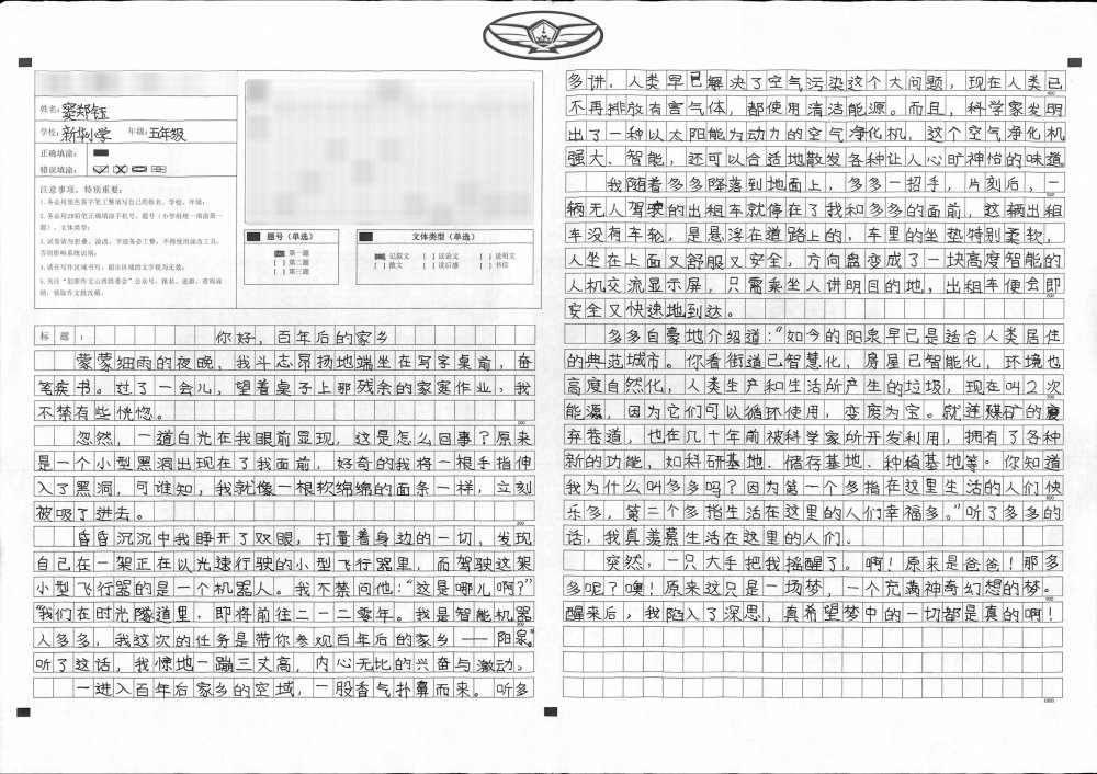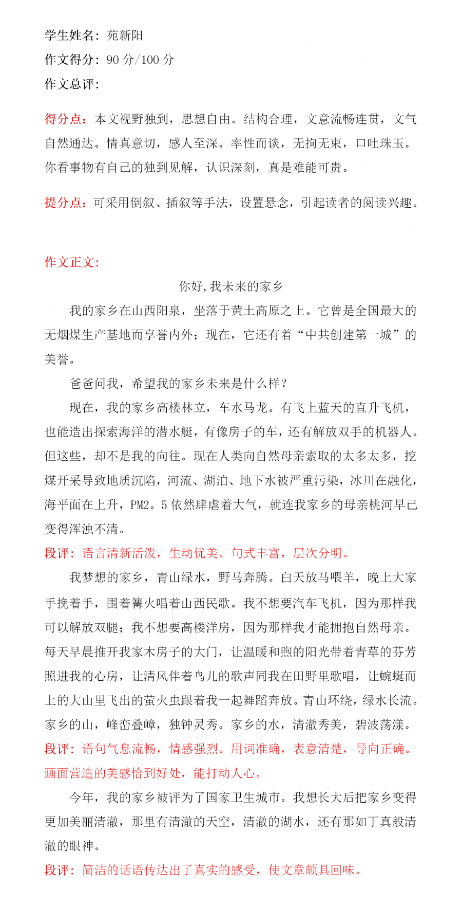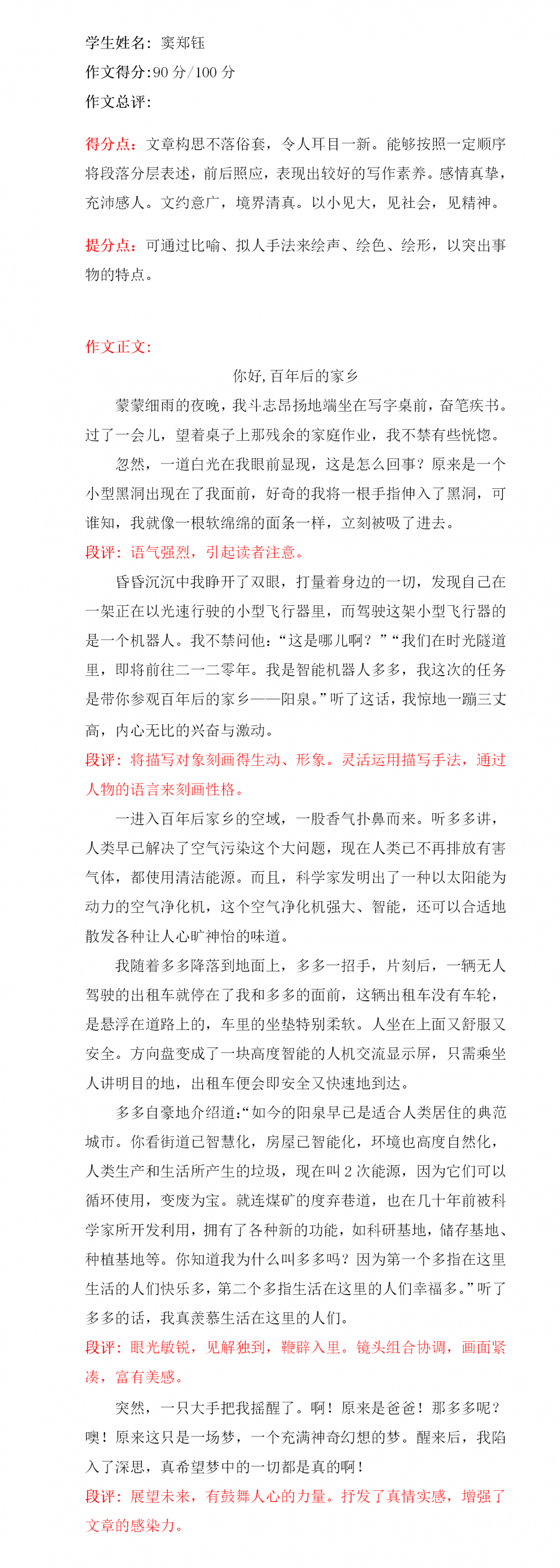想象大胆奇特,充满童真童趣是这篇习作显著的特点,尤其是以穿越开头,极大地引起读者的阅读兴趣,行文中处处渗透绿色、科技的理念,生动的笔触,极富想象力的语言,让人感受到小作者对家乡的热爱,是一篇值得推荐的习作!