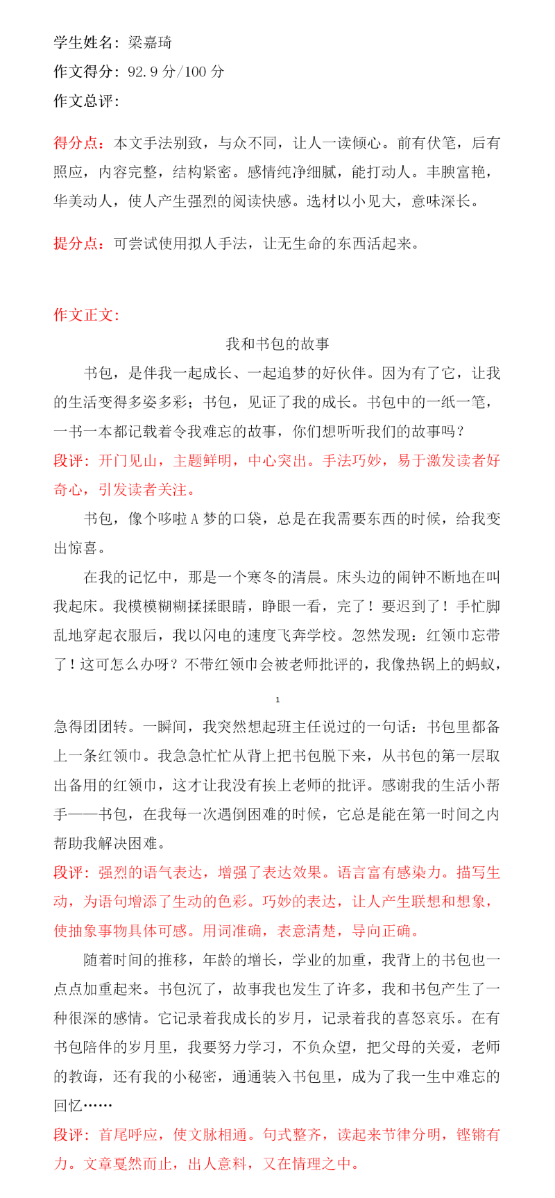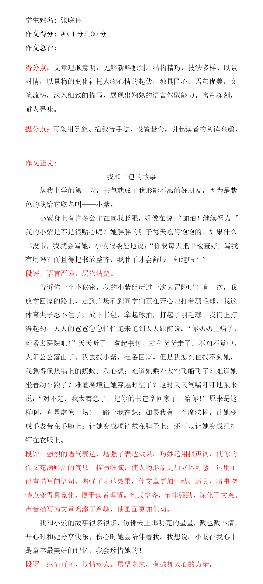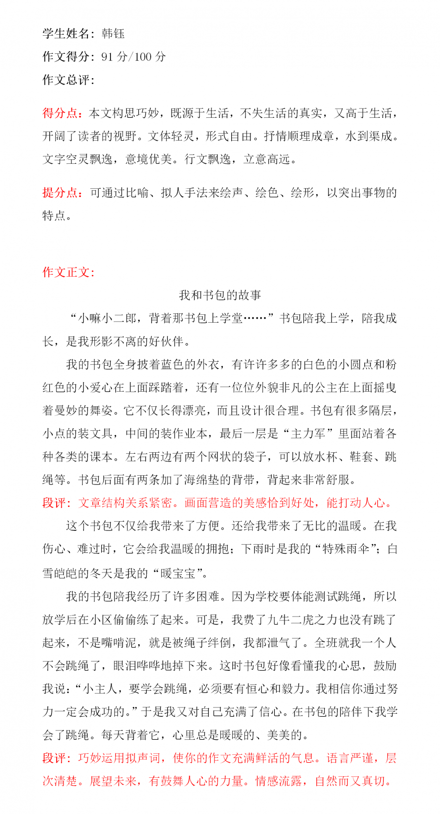 希望孩子在今后的学习生活中善于观察,勤于思考。多阅读,多积累,多实践,不断加强自己的写作能力,争取更大的进步。