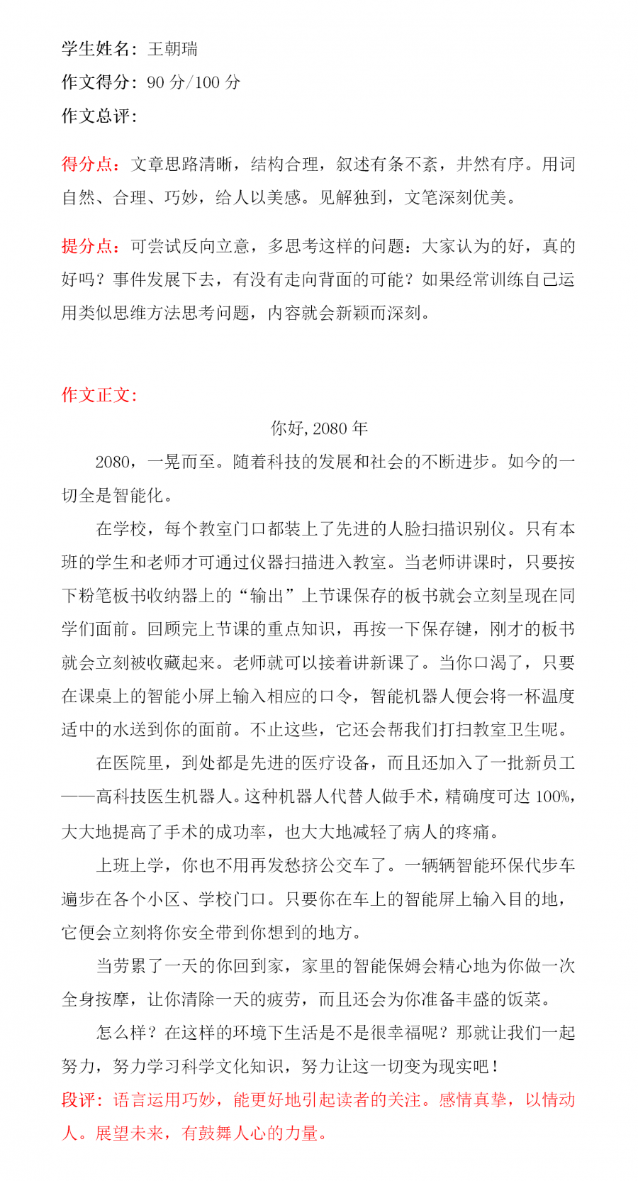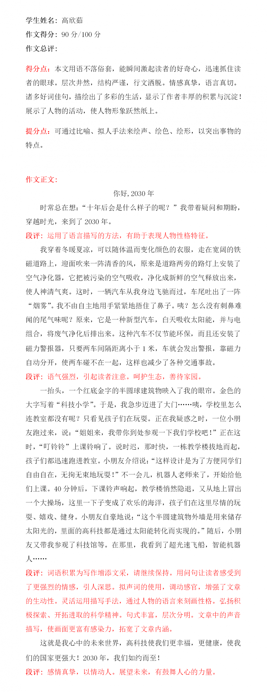 本文是一篇想象作文。小作者通过丰富的想象,对2030年人们穿的衣服、街道两旁的路灯,大街上的汽车以及未来的学校用生动形象的语言进行了描述,充分表现了科技对生活的影响,思路清晰,语言优美,结尾表达了小作者对未来生活的美好期盼!