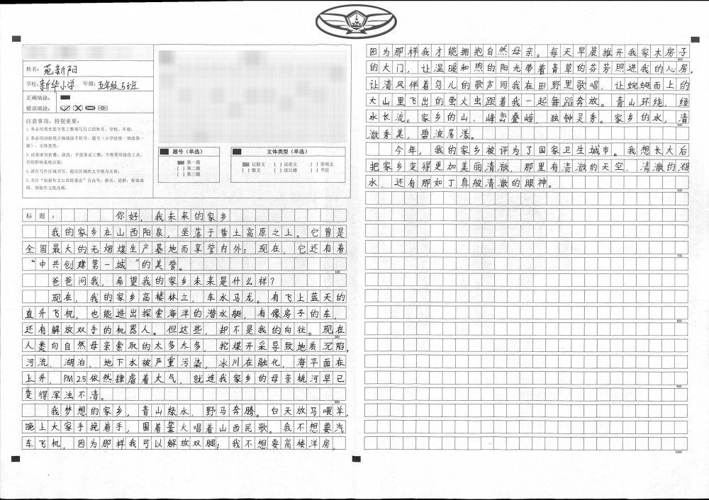 我认为未来的家乡应该是健康的、天然无污染的。最近我正听爸爸说四川和西藏正在上演一场“抢人”大战,而故事的主人公就是丁真,他是个20岁的藏族小伙,虽然他是藏族人,却住在四川甘孜,也让我知道了在广袤的四川大地上也生活这藏族人民。丁真的家就在格聂雪山的脚下,他的家乡有绿水,有青山,有属于他自己的世界,我也想要那样的家乡,一个无忧无虑的世界,向往着躺在草地上,看着成群的牛羊奔跑的生活。我更希望我的家乡阳泉,一个靠煤炭成长的城市也能变得绿水青山,返璞归真!