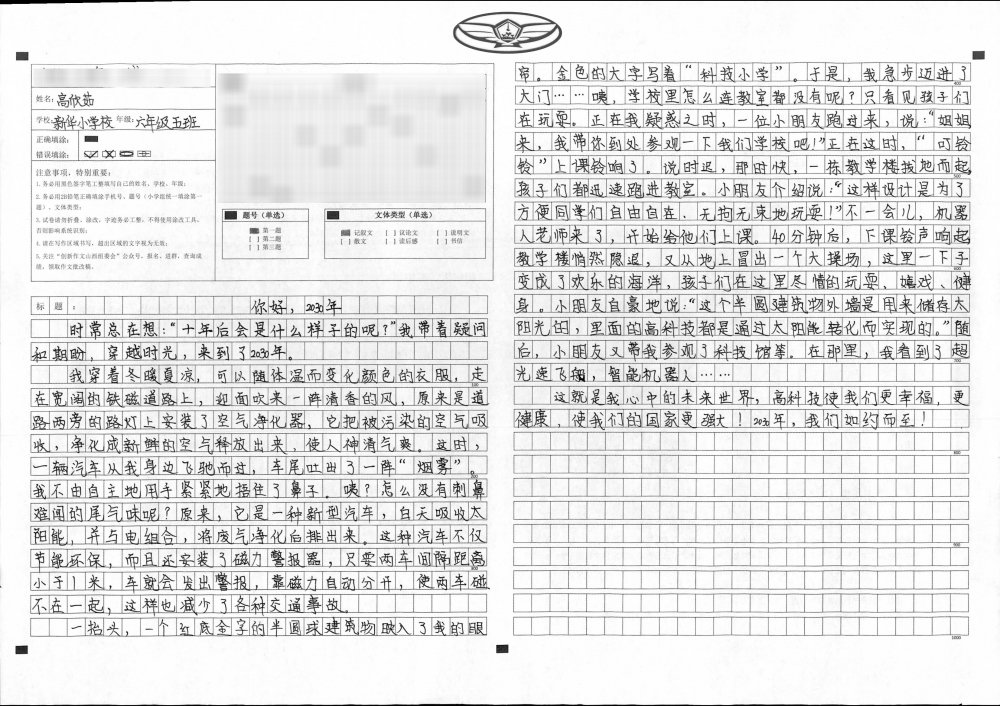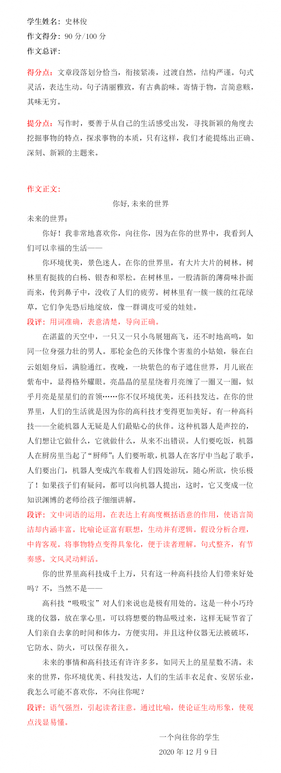 每个人都深爱着自己的家乡,希望家乡的环境更美好、科技更发达。而小作者的习作立意高远,引人深思。小作者心中未来的家乡是人与自然和谐共生的人间天堂!习作文笔优美,梦幻般的自然环境与人类舒适惬意的幸福生活自然地融为一体,深切地表达出了小作者对未来家乡的期盼与向往之情。