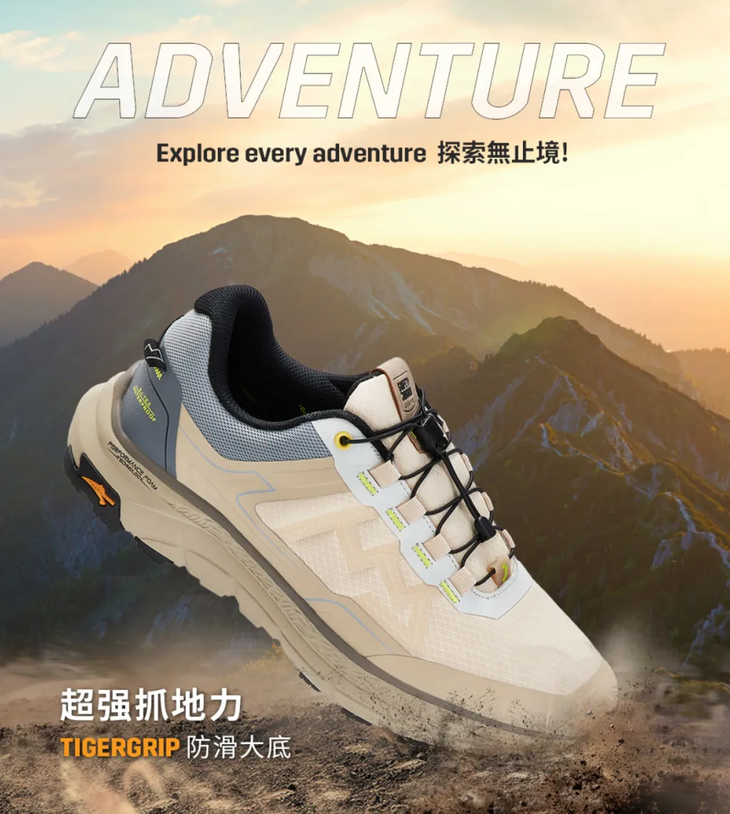 TigerGRIP 防滑大底抓地力远超普通标准,WaterpROOF防水科技全天候干爽透气,搭配缓震中底与环保透气鞋垫,久走不累。