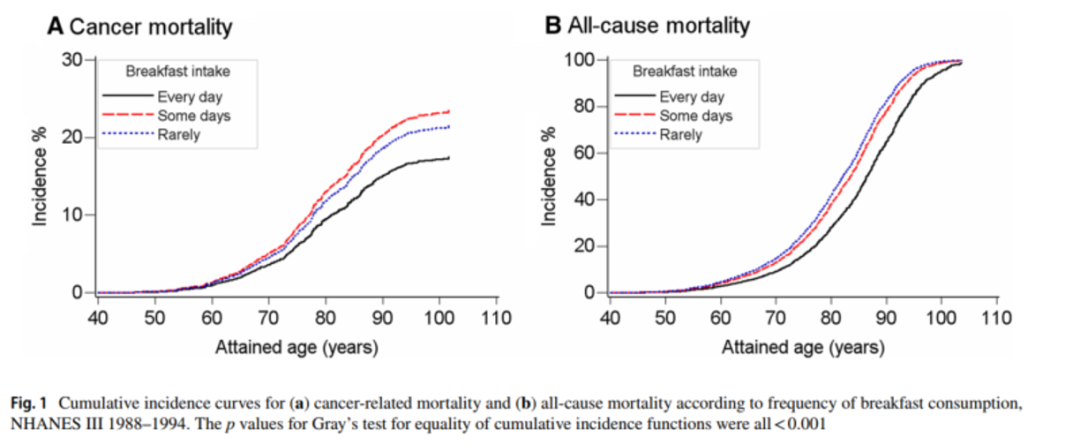 通过对三组人群长达22.2年的中位随访分析发现,很少或不吃早餐者的全因死亡和癌症死亡风险均升高(见下图)。