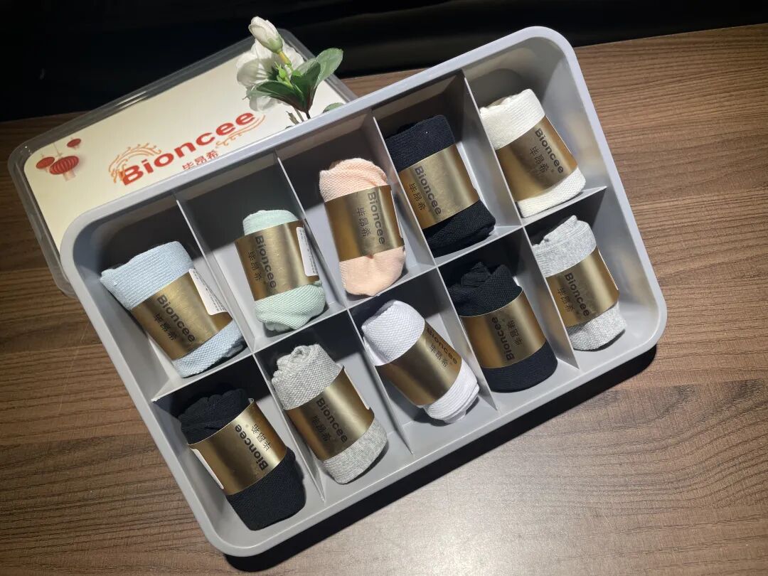 BIONCEE-7A金银花精油抑菌袜,每一双都是采用的200针纱线织造,细腻紧密,脚踩在平地上的感觉比打赤脚还舒服。