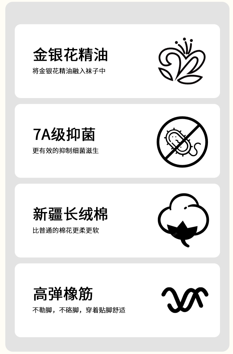 劣质的袜子除了让你丢了面子还会因为滋生细菌而臭气熏天那味儿可是真鲜……脚臭不是病,但脱鞋真的会要人命。它让你不敢在公众场合脱鞋,逛街不敢试鞋,做客不敢换鞋,就算是夏天也不敢穿凉鞋。人的脚上约25万条汗腺,每天能分泌上百毫升的汗液,春夏更甚。尤其汗腺发达,透气性差的袜子让双脚长时间憋在潮湿闷热的空间里,细菌真菌大量滋生!同时滋养650多种数以百万的细菌真菌螨虫,一脱鞋就像从蒸笼里出来,一股臭味扑面而来。BIONCEE-7A抑菌金银花精油云感阿克苏新疆棉袜:给双脚一个无菌又干爽的棉柔环境,它一定会刷新你的认知,特定礼盒包装,高端又大气,打开能闻到金银花精油味,特别舒缓放松。它采用远红外抑菌波频抗菌技术,穿上脚不臭,清凉干爽,真正穿7天都不会臭的袜子。