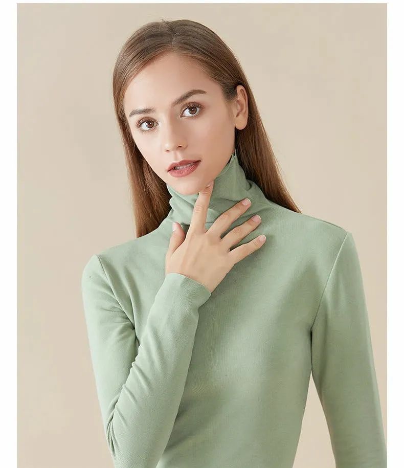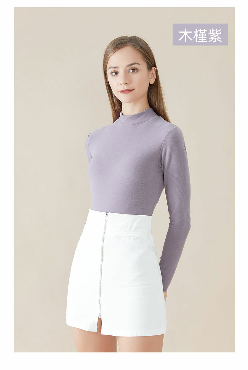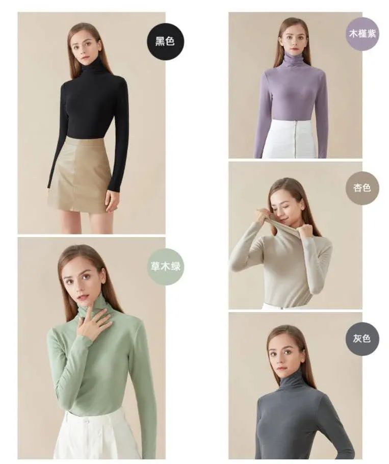 其实说白了,不光款式不咋地,而且也没那么保暖还显臃肿。尤其,回到家秋衣秋裤一掀,胳膊大腿全是“蛇皮纹”,皮屑带着静电哗哗地往外飘。皮肤干!干!干!特别是暖气一开,时不时就会痒起来。说到底还是贴身的衣服没选对,这款超级好穿的——德绒打底衫,我觉得有了它就可以不用穿秋衣了,完全可以取代秋衣。首先,最主要的就是手感如同羊绒般细腻,贴身穿一点也不扎,带给你超乎想象的温度!拿到手,手感非常!非常!非常!柔软。上次备受好评的双面德绒高领/半高领打底衫是必须给大家返团的,这次还有一个圆领,颜色有很多可选,图片只做展示哈~